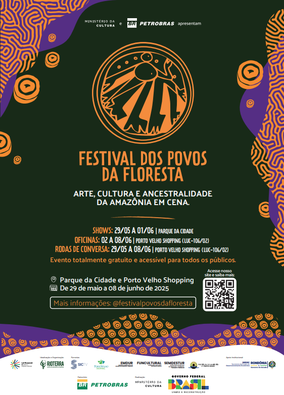 A riqueza ancestral, a força criativa e as vozes da Amazônia ganham protagonismo nacional com o Festival dos Povos da Floresta, evento itinerante que percorrerá por cinco capitais brasileiras entre 2025 e 2026. A primeira edição acontece em Porto Velho (RO), do dia 29 de maio até 8 de junho, reunindo uma programação multidisciplinar gratuita que integra exposições de artes visuais, apresentações indígenas, oficinas formativas, rodas de conversa e shows musicais.